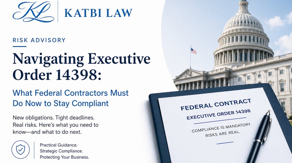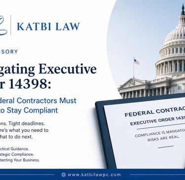 Executive Order 14398, issued March 26, 2026, introduces significant changes to federal contracting practices regarding diversity, equity, and inclusion (DEI) activities. This risk advisory provides a general overview of key developments. Contractors performing federal work should consult Katbi Law PC for legal advice tailored to their specific circumstances and compliance obligations.